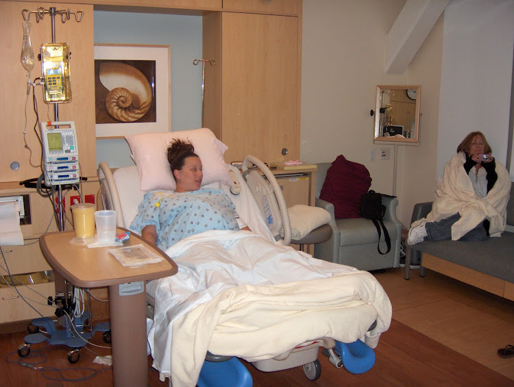 Midnight came and Kelly and Dana walk through the doors! I start having a little more pain and decided it was time to start thinking about an epidural. I got my first epi around 1:30...didn't work. They redid the epi and I was a happy camper around 2:30. At this point they broke my bag of water and checked me. I was dilated to 6...I couldn't believe that since 10:00 I only progressed by 1 centimeter. What a sad thing to hear.